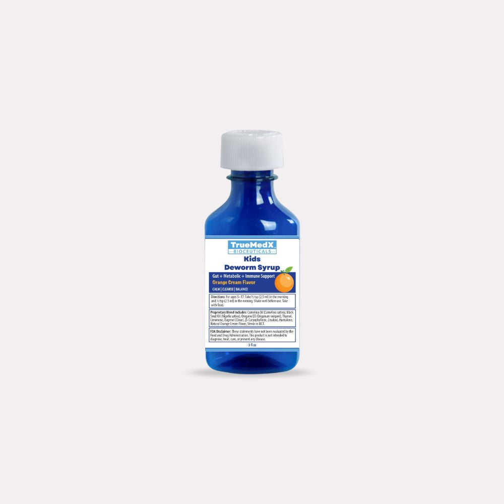 TrueMedX Kids Balance Syrup is a delicious, easy-to-take formula designed to support children’s natural rhythms of digestion, metabolism, and internal balance. This kid-safe oil blend combines gut-friendly botanicals like black seed and oregano with calming, immune-supportive terpenes — all lightly sweetened and flavored for picky palates.